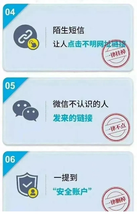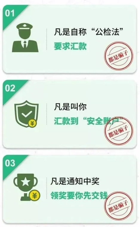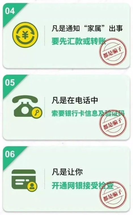 (3)凡是自稱公檢法機關或醫(yī)保局等部門,以涉嫌嚴重違法犯罪并需要保密等為由,索要銀行卡信息及密碼、驗證碼進行“資金清算”或者讓你直接把錢打到所謂的“安全賬戶”的。